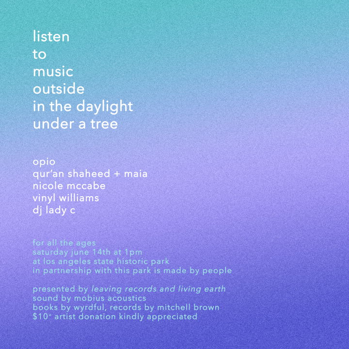 Performing live are Qur’an Shaheed & Maia, Nicole McCable, Vinyl Williams, and Opio. DJ Lady C will be spinning records throughout the afternoon. Mobius are back with their HiFi handmade sound system. Wyrdful Books & Mitchell Brown are pulling up to prescribe the deepest of tones and poems that you’re looking for. Matthewdavid holds the mic to guide us through the day. Pull up with a blanket, a picnic, and we’ll see you real soon.