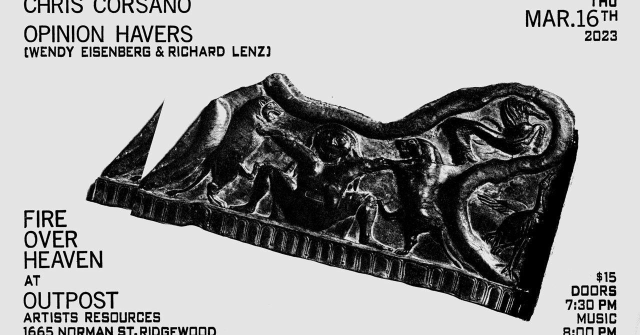 Thursday, March 16th: Fire Over Heaven continues with a double header featuring a rare solo performance by drumkit extraordinaire Chris Corsano and Wendy Eisenberg and Richard Lenz's duo, Opinion Havers. I remember being wowed by Chris' drumming when the new millennium was still in the low single digits and in the years since he's played with everyone from Bill Orcutt and Joe McPhee to Björk. Every time I see him he seems to expand our collective sense of what a drum set is in some way. He's working on an extended set up for this occasion so I'm sure this show will be no exception... Happily we've been able to reschedule Wendy Eisenberg from January's cancellation and they'll be appearing with a new duo project called Opinion Havers, with bass clarinet and electronics operator Richard Lenz. The pair coax equal parts synthetic blasts, low end skronk, scraped strings, articulated runs and space from their respective instruments.